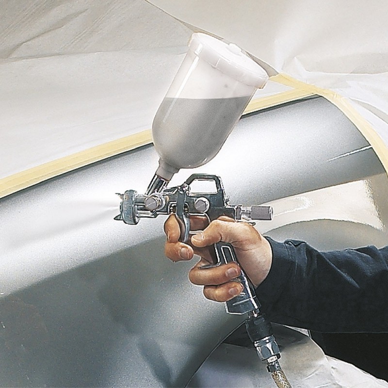 La pistola profesional de pintura con gravedad es una herramienta robusta y precisa para trabajos de pintura, con una presión de trabajo de 3 a 3,5 bar. Esta pistola de pintura profesional tiene un regulador de cono