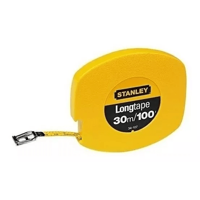 DESCRIPCIÓN: Cinta Métrica de Acero 30 metros Stanley: 34-107S Caja ABS amarilla de alto impacto y alta visibilidad. Cinta ancha amarilla de 3/8″ (10 mm) con recubrimiento de polímero para mayor durabilidad. Hoja de acero de 0,045 (1,1 mm) de espesor Tambor de fácil rebobinado. Marcas fáciles de leer. Gancho se retrae fácilmente en la caja. Ancho-Hoja: 9.5 mm (3/8″) Largo-Hoja: 30 m (100′)