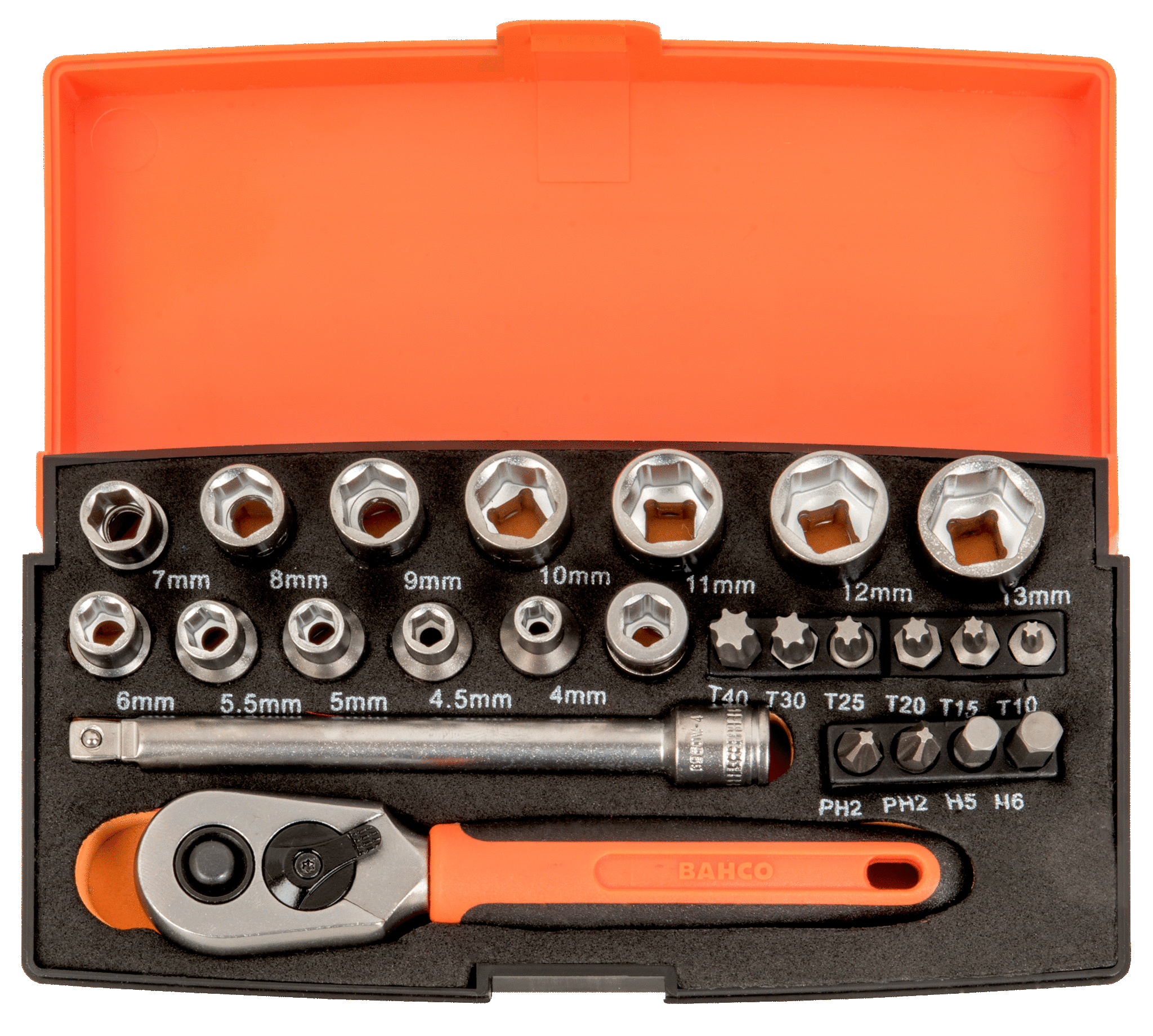 - 12 vasos hexagonales de 1/4″: 4, 4,5, 5, 5,5, 6, 7, 8, 9, 10, 11, 12, 13 mm.