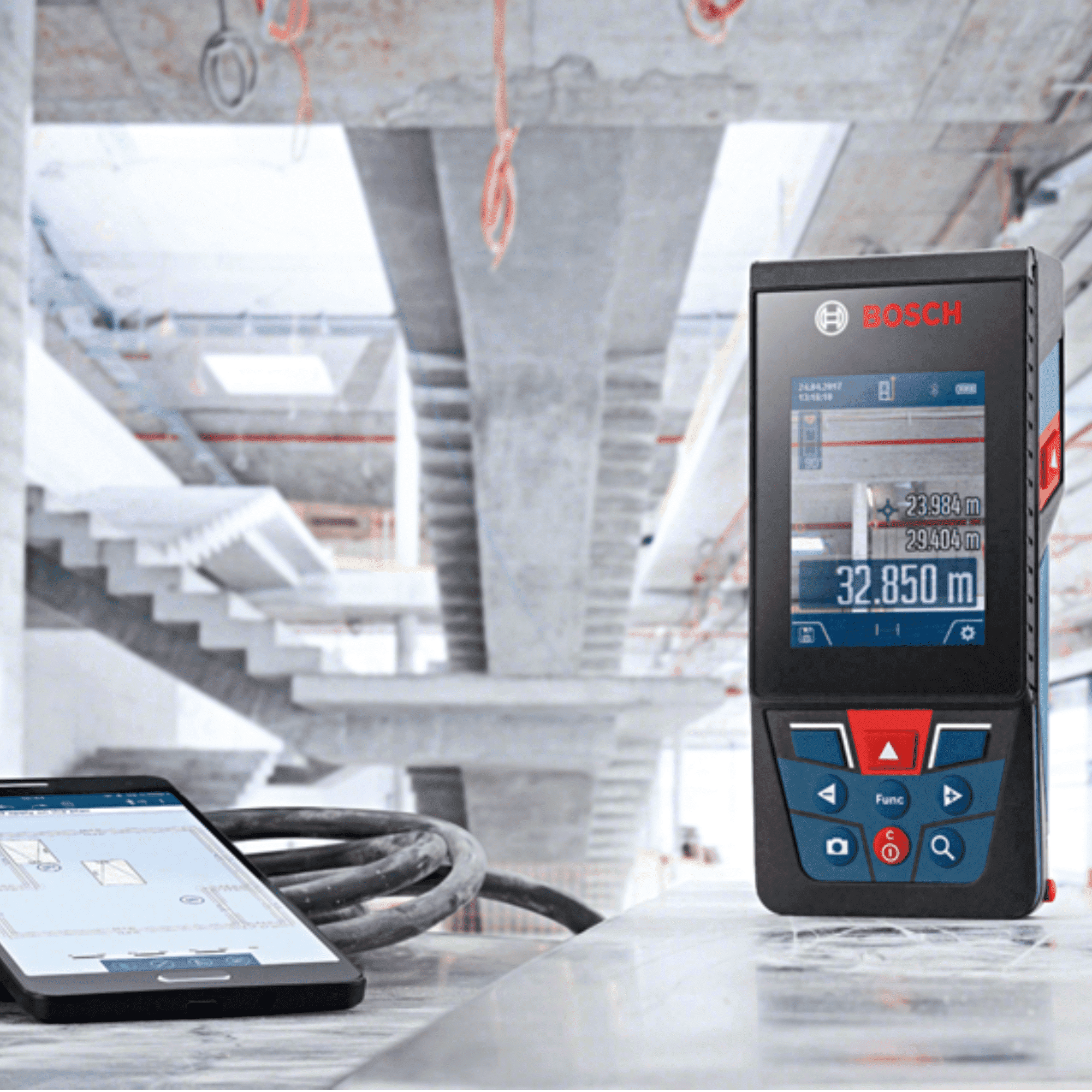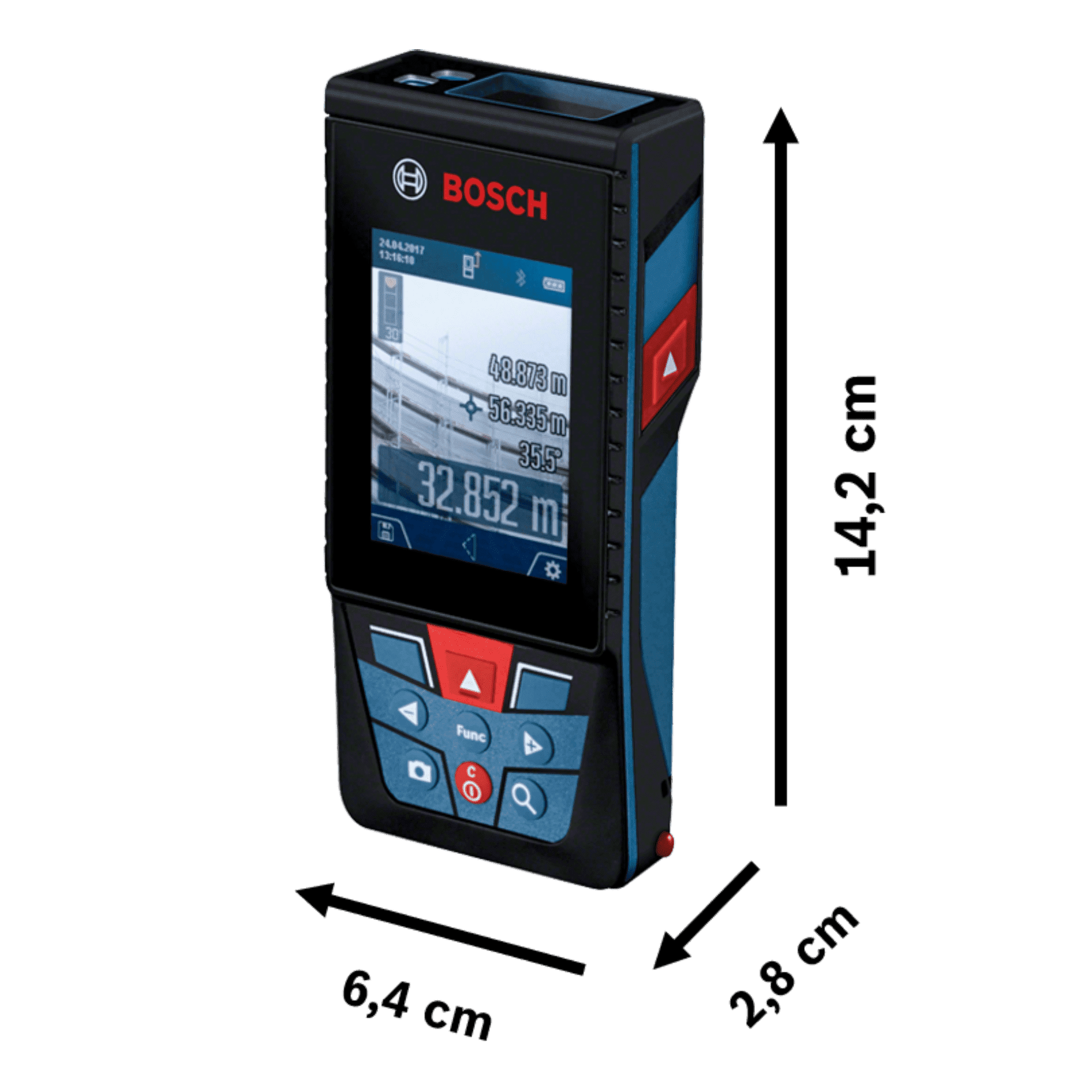El medidor Bosch GLM 120 C es un medidor de distancias con alcance de hasta 120 metros y es posible conectarlo con el celular. Todas las funciones que necesitas ahora con cámara para ambiente externo, realiza fácilmente medición de distancias con solo apuntar el láser hacia el lugar que deseas medir y presionar el botón; es posible realizar mediciones continuas y ver el resultado en la pantalla en tiempo real mientras se mueve el medidor; puedes realizar mediciones de áreas, solo es necesario medir el ancho y el largo del espacio y el dispositivo calculará al instante cuantos metros cuadrados tiene el lugar; para medición de volumen, es necesario medir el ancho, largo y alto del área y el dispositivo calculará cuantos metros cúbicos tiene el ambiente. También puedes realizar mediciones de altura indirecta, el medidor Bosch calcula fácilmente la altura incluso en lugares que no tienen techo como referencia. Con este dispositivo puedes nivelar superficies pequeñas, puedes obtener la inclinación (en grados) sólo colocando el medidor sobre la superficie a nivelar. Gracias a la conectividad con tu smartphone puedes hacer planos de plantas con medidas, con este beneficio no será más necesario hacer bocetos en papel, puedes realizar planos digitalizados en proporción y con la facilidad de tenerlos en el celular. Agrega medidas a tus fotos: anota con exactitud los espacios que estás midiendo, evitando errores que podrían tener los bocetos manuales, finalmente y lo más importante de todo es que puedes medir en exteriores, incluso en pleno sol, gracias a la cámara puedes saber exactamente dónde está apuntando el láser y estar seguro de la medida realizada.
