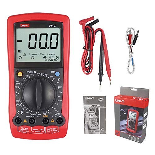 UNI-T UT107 es un multímetro digital diseñado para talleres automovilísticos. Permite medir corriente DC, voltaje AC/DC, resistencia, frecuencia, temperatura, velocidad de rotación del cigüeñal, realizar chequeo de diodos y probar continuidad de circuitos.