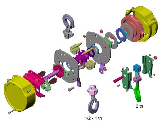 • Ganchos de aceros forjados giratorios con traba de seguridad, reduciendo la torsión de la cadena. Ante una sobrecarga no se rompen sino que se abren en forma paulatina, evitando la caída repentina de la carga.